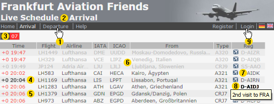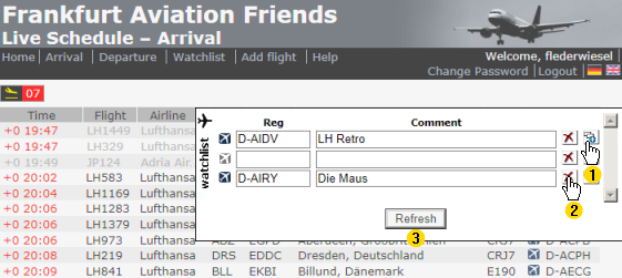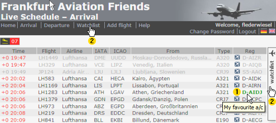 - (1) Let your favourite aircrafts be hilighted in green. A list thereof - including a comment per aircraft - will be stored within your user profile.