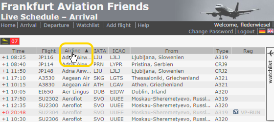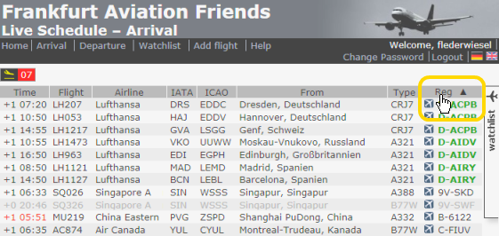 - If you are logged in and have defined a watchlist, the watched aircrafts will be sorted first.